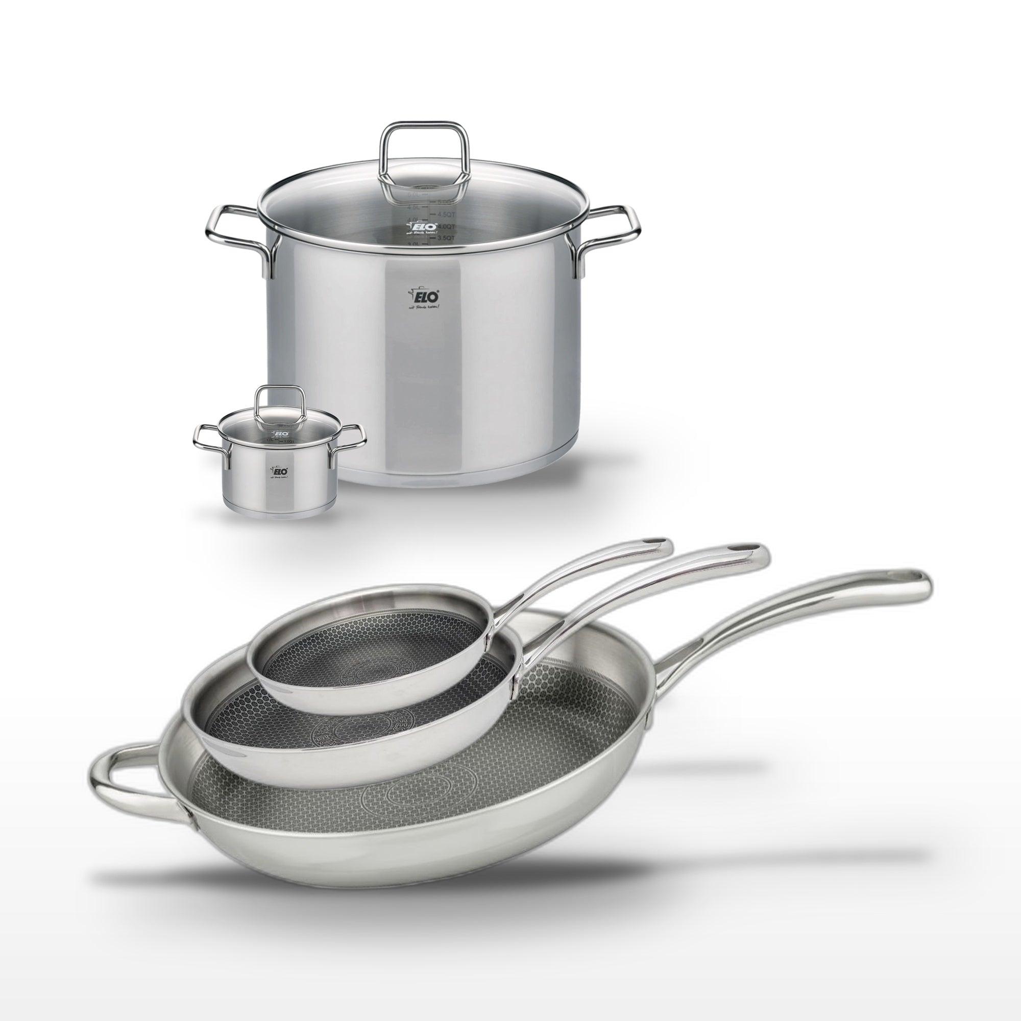 - DESCRIPTION : DESCRIPTION : Le lot Elo Relief Evolution inclut des poêles de 32 cm, 28 cm, 24 cm et des faitouts de 26 cm, 12 cm, en acier inoxydable avec revêtement antiadhésif pour une cuisson saine.