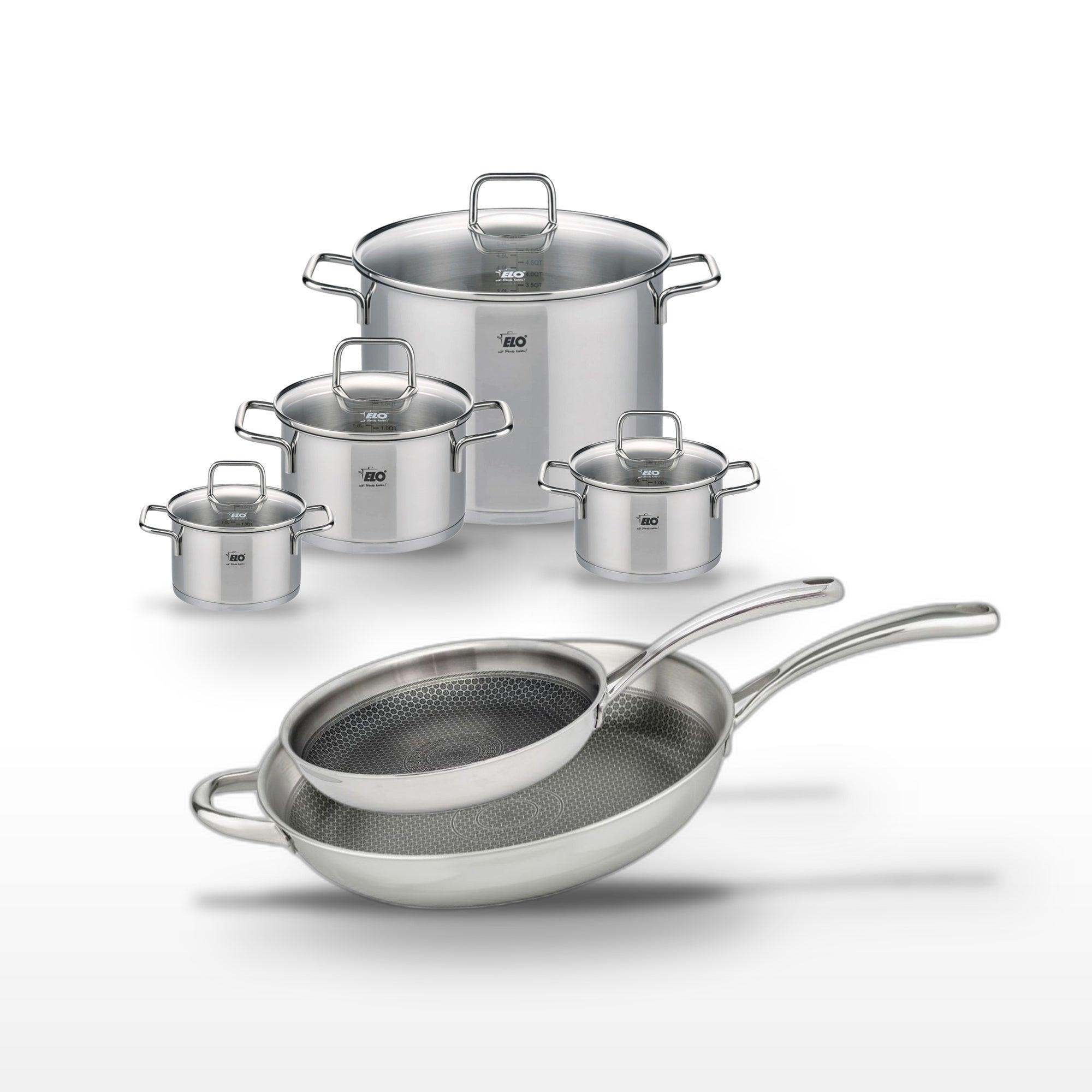 - DESCRIPTION : Cet ensemble Elo combine des poêles antiadhésives et des faitouts en inox, pour une cuisine variée et saine.