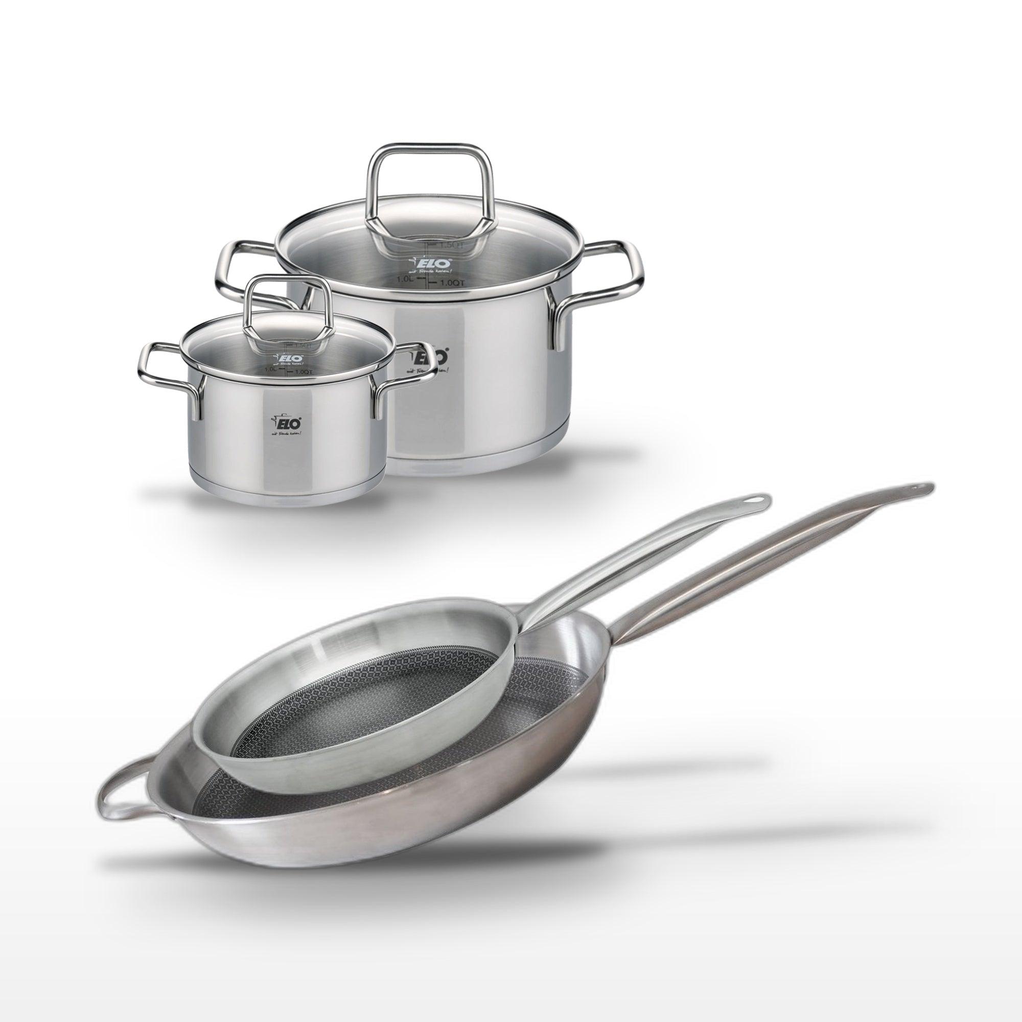 - DESCRIPTION : Ensemble de poêles et faitouts en inox Elo Relief Solution pour une cuisine polyvalente et performante.