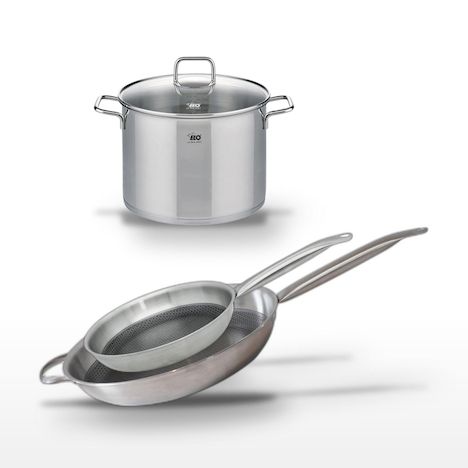 L'ensemble Elo Relief Solution se distingue par sa qualité exceptionnelle et sa polyvalence. Composé de deux poêles en acier inoxydable de 32 cm et 28 cm, et d'un faitout de 26 cm, cet ensemble est conçu pour répondre aux besoins des professionnels de la cuisine. Les poêles, dotées d'un revêtement antiadhésif ELODUR® Select sans PFAS, assurent une cuisson sans accroche et un nettoyage simplifié. Le faitout de 9,5 litres est parfait pour préparer des plats mijotés pour des groupes. Chaque pièce est fabriquée avec des matériaux de haute qualité, garantissant une distribution uniforme de la chaleur et une compatibilité avec tous les types de feux, y compris l'induction. Le design élégant, avec des bords verseurs et des manches ergonomiques, ajoute une touche de sophistication à votre cuisine. Elo, marque reconnue pour sa durabilité et son innovation, offre une garantie de 4 ans, assurant un investissement fiable et durable pour les professionnels exigeants.