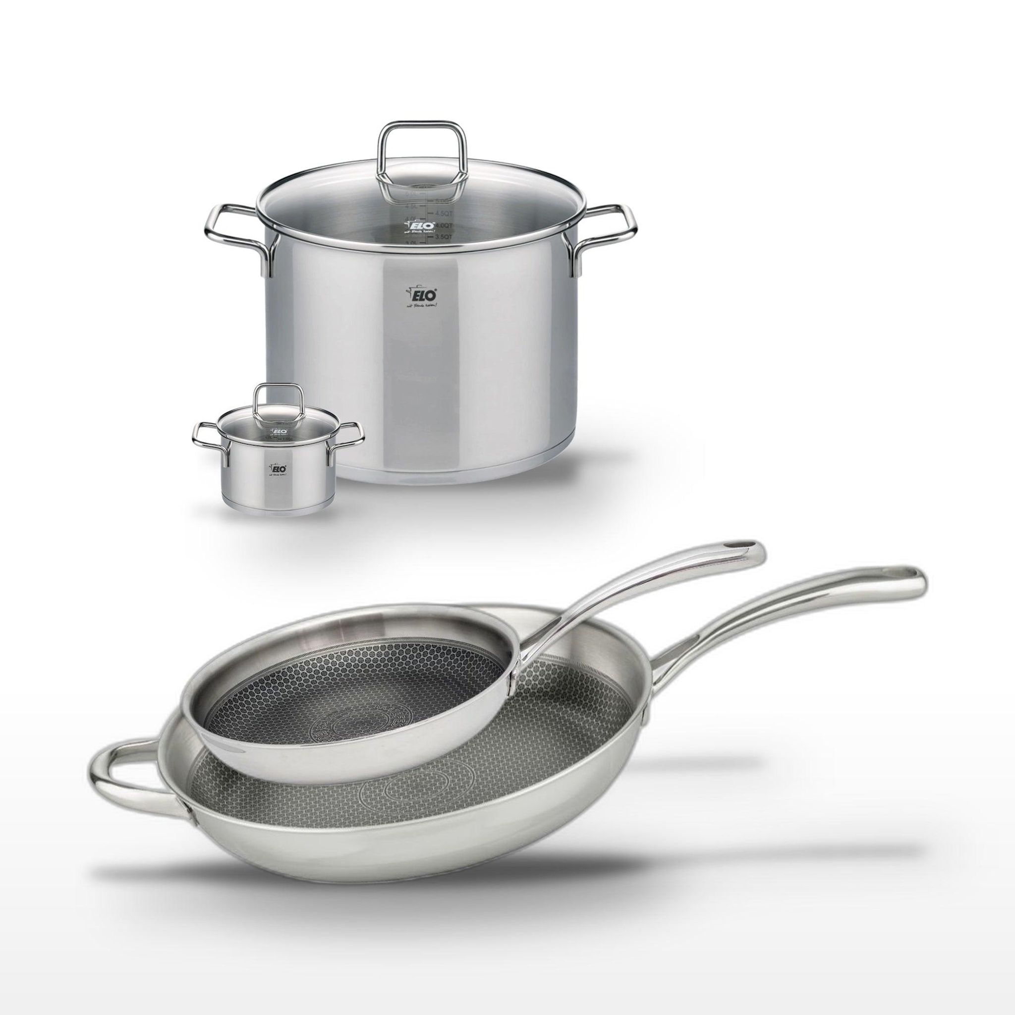 - DESCRIPTION : Ce lot Elo Relief Evolution propose deux poêles en inox 18/10 et deux faitouts, idéaux pour une cuisine variée et saine grâce à leur revêtement antiadhésif.