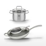 - COMPOSITION : COMPOSITION : Acier inoxydable 18/10 de haute qualité avec noyau en aluminium pour les poêles, et acier inoxydable pour le faitout.