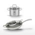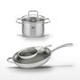 - COMPOSITION : Structure Triply en acier inoxydable 18/10 avec noyau en aluminium pour les poêles, et acier inoxydable avec couvercle en verre pour le faitout.