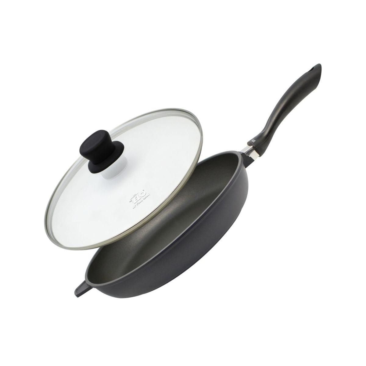 - COMPOSITION : La poêle à frire est faite en fonte d'aluminium avec un revêtement antiadhérent en céramique Elodur sans PFAS et le couvercle est en verre avec une poignée en plastique qui reste froide