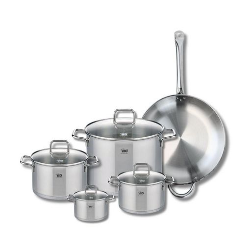 Découvrez notre batterie de cuisine en inox sans PFAS de la marque Allemande ELO, reconnue pour sa qualité. Ce set polyvalent comprend une poêle à frire de 32 cm, et 4 faitouts de 12 cm, 16 cm, 20 cm et 26 cm de diamètre. L'inox est un matériau facile à entretenir, robuste, résistant à la corrosion et esthétique. Ces ustensiles sont compatibles avec tous les types de feux dont l'induction, et passent au four (sauf les couvercles).