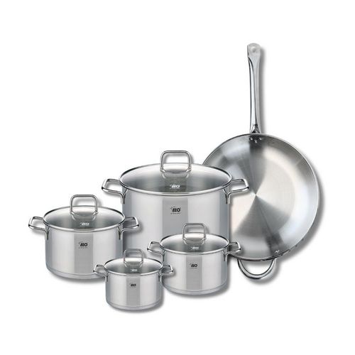 Découvrez notre batterie de cuisine en inox sans PFAS de la marque Allemande ELO, reconnue pour sa qualité. Ce set polyvalent comprend une poêle à frire de 32 cm, et 4 faitouts de 12 cm, 16 cm, 20 cm et 26 cm de diamètre. L'inox est un matériau facile à entretenir, robuste, résistant à la corrosion et esthétique. Ces ustensiles sont compatibles avec tous les types de feux dont l'induction, et passent au four (sauf les couvercles).