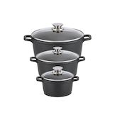 Elo vous propose cet ensemble de 3 casserole faitout de 16, 20 et 24cm de diamètre et 3 couvercles en verre.
