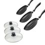- CONTENU : 3 poêles tous feux, compatible gaz, induction, vitrocéramique et électrique + 3 couvercles en verre