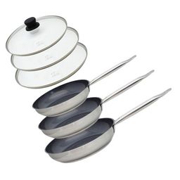 - COMPOSITION : Ces poêles sont en acier inoxydable 18/10, réputé pour sa durabilité et sa conductivité thermique , le revêtement céramique ELODUR® Professional est sans PFAS et hautement résistant aux rayures , les couvercles sont en verre et inox
