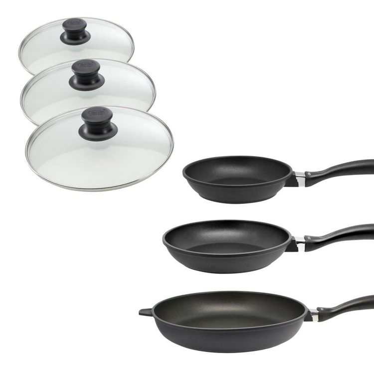 Poêles : 24 x 5 cm | 28 x 6 cm | 32 x 7 cm / Couvercles : Diamètres : 24 cm | 28 cm | 32 cm