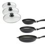 - CONTENU : 3 poêles tous feux, compatible gaz, induction, vitrocéramique et électrique + 3 couvercles en verre