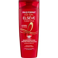 Shampoing Soin Protection Couleur pour Cheveux Colorés ou Méchés, enrichi en Pivoine et Filtre UV pour une nutrition intense et une couleur protégée jusqu'à 10 semaines*. *Test instrumental après application du Shampoing + masque de la gamme Résultats prouvés : Protège tous les cheveux colorés ou méchés jusqu'à 10 semaines* : Prolonge l'intensité et l'éclat de la couleur** et nourrit les cheveux pour un toucher soyeux et une couleur éclatante. *Test instrumental après application du Shampoing et démêlant de la gamme **Test consommateur après application du Shampoing et démêlant de la gamme L'Oréal Paris Elseve Color-Vive Shampoing Soin Protection Couleur enrichi en Pivoine et Filtre UV pour cheveux Colorés ou Méchés 400 ml