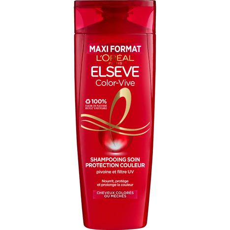 Elseve, Color-Vive, L'Oréal Paris, Shampoing Cheveux Secs, Cheveux colorés, Cheveux ternes, cheveux méchés, pivoine, Shampoing soin protecteur de couleur, Shampoing protection couleur, filtre UV, Brillance, Nutrition, Fluidité, couleur éclatante, couleur prolongée, couleur protégée, couleur terne