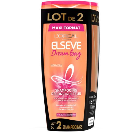 L'Oréal Paris Elseve Dream Long Shampooing Reconstructeur enrichi en Huile de Ricin et Kératine pour Cheveux Longs Lot 2x400mL 800 ml