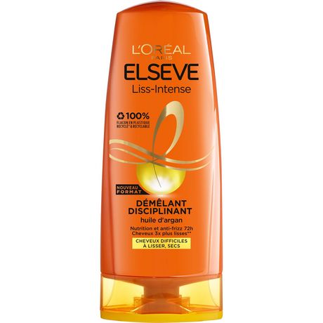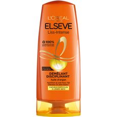 Après-Shampoing Démêlant Disciplinant pour cheveux difficiles à lisser, enrichi en Huile d'Argan pour des cheveux démêlés 3x plus lisses* et une action anti-frizz 72h*. *Test instrumental après application du Shampoing + démêlant de la gamme. Résultats ? - Des cheveux démêlés 3x plus lisses* - Une action anti-frizz 72h* pour un lissage durable - Une nutrition Intense *test instrumental après application du Shampoing + démêlant de la gamme. L'Oréal Paris Elseve Liss-Intense Après-Shampoing Démêlant Lissant Anti-Frizz enrichi en Huile d'Argan 240.0MLT