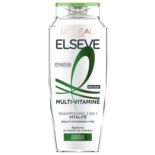 L'Oréal Paris, L'Oreal Paris, Elseve, Elsève, Shampooing, Shampoing, Shampooing Vitalité, Multi-Vitamines, Vitamines Cheveux, Vitamine E, Cheveux Normaux, Cheveux Revitalisés, Flacon Recyclable, Plastique Recyclé, Fabriqué en France, Made in France, Efficacité Soin, Tous Types de Cheveux