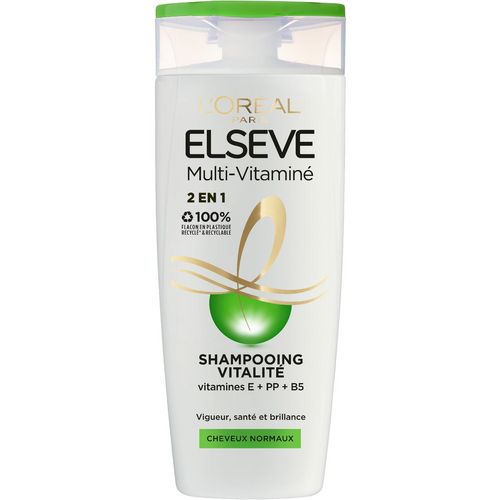 Cheveux normaux,Shampoing multivitaminé, shampoing 2 en 1, Brillance,Vigueur, shampoing aux vitamines, vitamines E vitamine B5, Elseve, L'Oréal Paris, cheveux revitalisés, cheveux brillants, cheveux vigoureux.