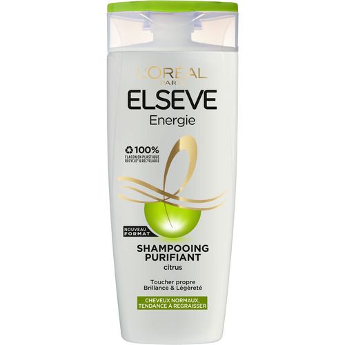 L'Oréal Paris Elseve Energie Shampooing purifiant pour cheveux normaux ayant tendance à regraisser enrichi en citrus 290 ml Shampoing Purifiant pour cheveux normaux ayant tendance à regraisser trop vite enrichi en citrus Des cheveux propres au toucher, brillants et légers, pour une sensation de fraîcheur et d'énergie.