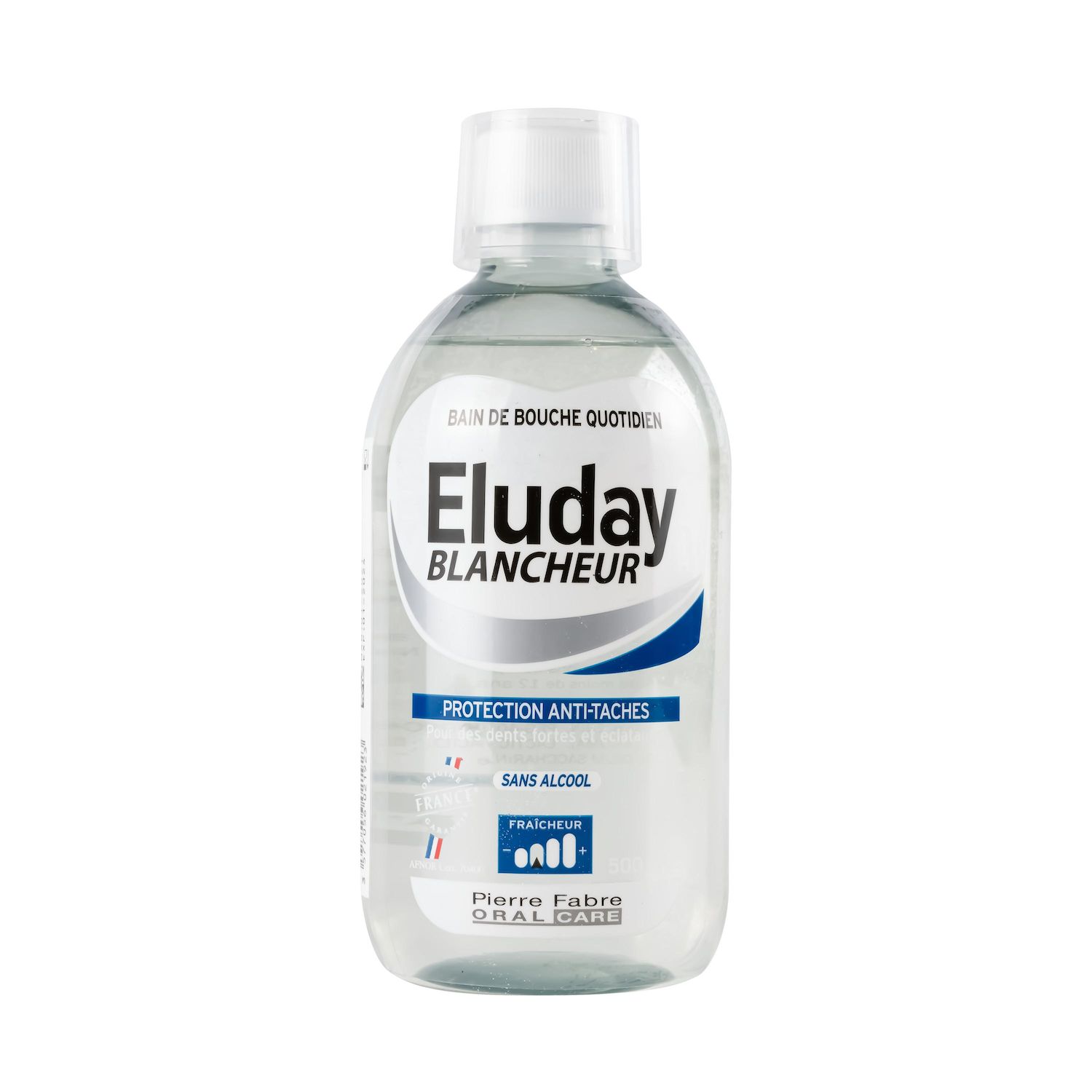 Eluday Blancheur bain de bouche permet de maintenir la blancheur naturelle des dents¹ et de renforcer l’émail². Le truc en plus : habitude indispensable à adopter pour une bouche propre et saine, ce bain de bouche blancheur limite la fixation des agents colorants sur l’émail et réduit la formation de plaque dentaire³. Son goût mentholé, frais et agréable, en fait un nouveau réflexe plaisir et soin. Son flacon transparent, constitué à 100% de plastique PET recyclé, se fond dans la déco de salle de bain les plus épurées. Il ne contient pas d’alcool et peut être utilisé dès l’âge de 12 ans. Certifié Origine France Garantie. ¹ Etude in vitro menée sur 12 échantillons d’émail exposés à des cycles de coloration avec du thé noir. ² Test de tolérance et d'efficacité mené sur 44 sujets pendant 3 semaines à raison de 2 utilisations par jour (questionnaire de satisfaction). ³ Test de tolérance et d'efficacité mené sur 44 sujets pendant 3 semaines à raison de 2 utilisations par jour.