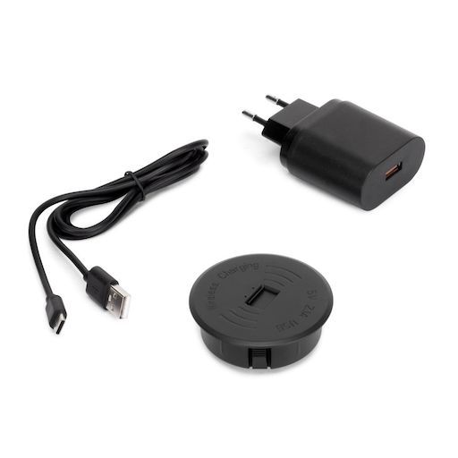 - Conçu pour l'intégration et l'installation dans les meubles de maison et de bureau avec un usinage de D. 60 mm pour pouvoir encastrer le dispositif et est fourni avec le chargeur et a une puissance de charge de 10W-USB / 10W-QI. Le câble a une longueur de 1,8 m.