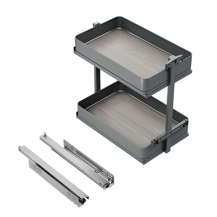 - Chariot coulissant avec 2 paniers, conçu pour maximiser le rangement et exploiter au mieux l'espace dans les meubles de cuisine – une solution à la fois fonctionnelle et esthétique.