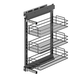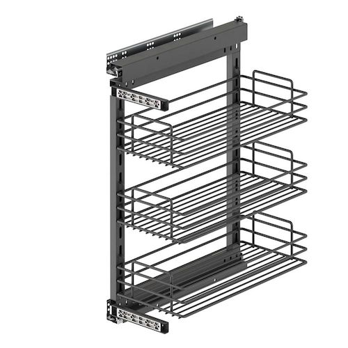 Chariot coulissant pour meubles bas de cuisine en acier et finition gris anthracite, idéal pour les petits espaces ou les meubles d'appoint.Installation facile et réglage total de la porte. La structure est en acier chromé à 3 niveaux et incorpore des guides à rouleaux à extraction totale et fermetu