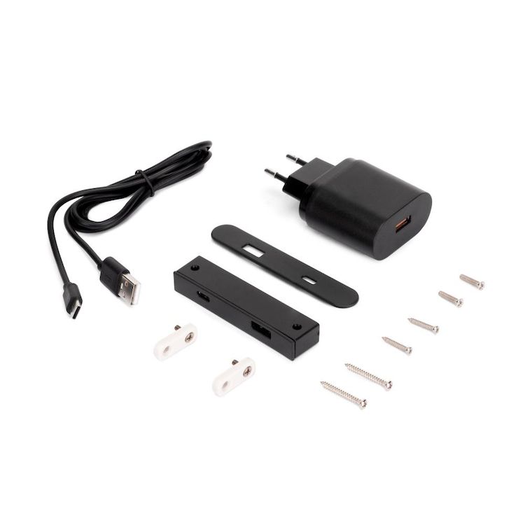 Il est fabriqué en plastique noir et est fourni avec tout ce qui est nécessaire pour le montage, comme la base de chargement, un câble USB de 1,8 m, un chargeur mural, un couvercle encastré, un couvercle en saillie, des vis et des attaches.