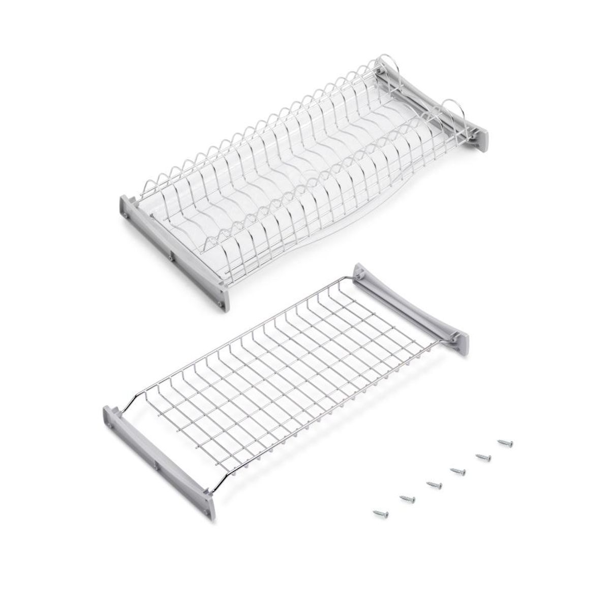 , il suffit de visser les ancrages dans le meuble de cuisine et de placer les plateaux. Fabriqué en acier résistant à la rouille, avec des ancrages en plastique gris à l'unité et un bac de récupération en plastique.