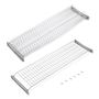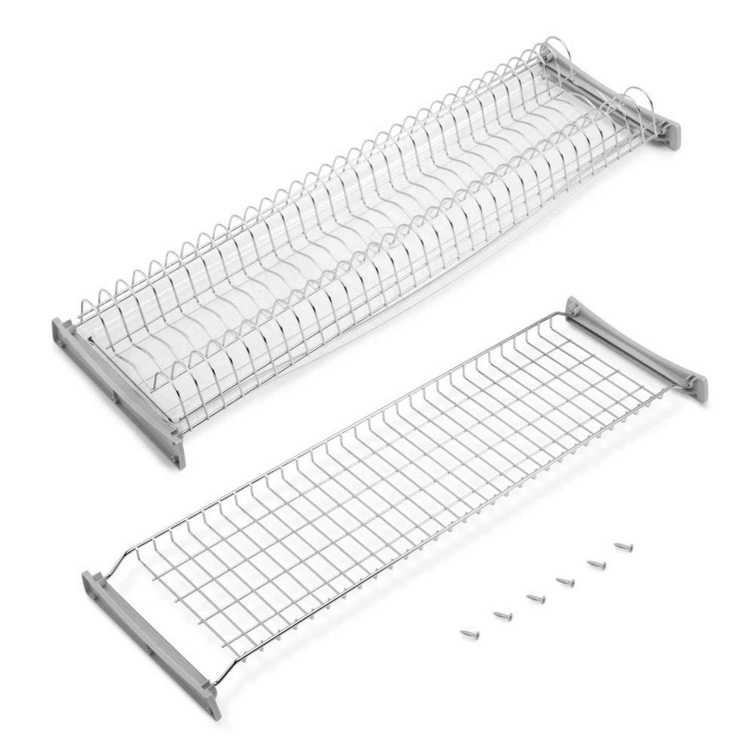 , il suffit de visser les ancrages dans le meuble de cuisine et de placer les plateaux. Fabriqué en acier résistant à la rouille, avec des ancrages en plastique gris à l'unité et un bac de récupération en plastique.