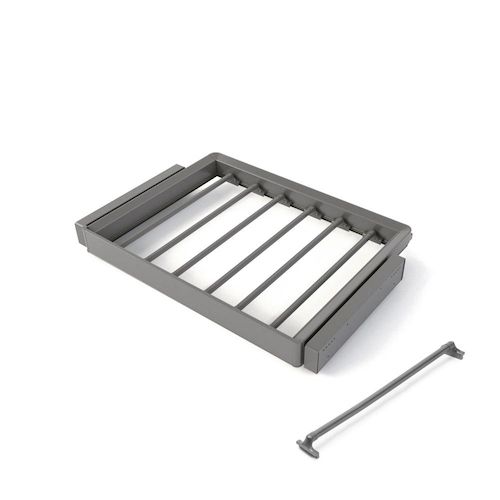 - Comprend 7 tringles d'une longueur de 420 mm, pour maximiser l'espace dans les armoires et les dressings, permettant un rangement ordonné des pantalons et autres vêtements sans les froisser. Fabriquées en aluminium avec une finition titane (RAL 7039), avec des extrémités en plastique, ce qui leur confère une grande stabilité et fiabilité dans leur utilisation quotidienne.