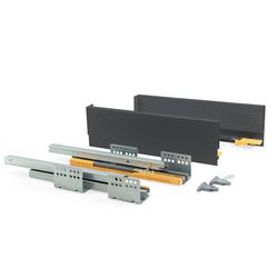 Le tiroir de cuisine et salle de bain Concept est disponible en kit avec toutes les ferrures nécessaires pour le montage et offre une grande capacité de charge, jusqu'à 30 kg par tiroir. Le kit contient les coulisses à sortie totale et fermeture amortie , un jeu de fixations et un jeu de côt
