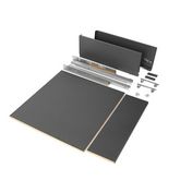 Kit pour tiroir de cuisine et salle de bain avec tous les éléments nécessaires à son montage. C'est la solution optimale pour vos meubles de cuisine, de salle de bain ou d'armoire avec un design élégant en gris anthracite et blanc. Chaque kit est composé de tous les éléments nécessaires au montage d'un tiroir extérieur de hauteur 178 mm et d'une profondeur de 500 mm avec différentes largeurs de modules. Comprend: deux côtés latérales, un ensemble de guides à fermeture amortie, un ensemble de couvre-garnitures, des panneaux inférieur et arrière et des attaches avant de tiroir. Vous aurez simplement besoin du panneau avant avec les dimensions nécessaires du tiroir.