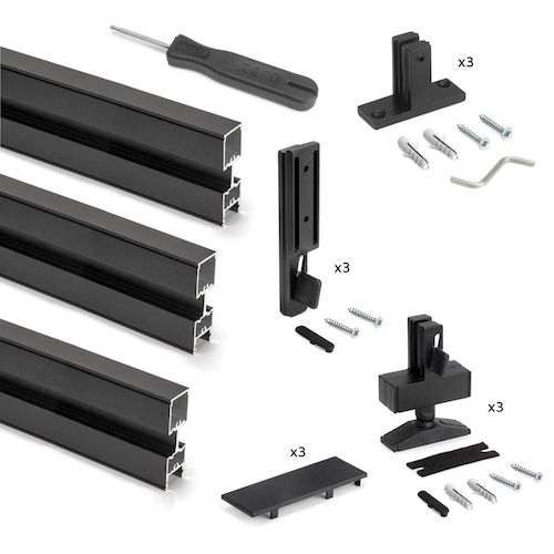- Composition du kit : 3 profilés d'une longueur de 2,115 mm, 3 profilés d'une longueur de 210 mm, 3 fixations murales, 3 raccords de profilés, 3 niveleurs, 3 caches pour profilé ainsi que les vis de montage.
