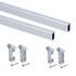 Disponible en deux tailles de tube: 750 mm et 1150 mm. Les kits de 1150 mm contiennent 2 supports centraux supplémentaires pour plus de rigidité. Les supports latéraux permettent 2 types de montage: sur les côtés du module avec vis filetage bois Ø3.5 ou montage supérieur avec vis M6x40 mm fournies. Conformément à la norme ISO: 7170:205, le tube et les supports supportent jusqu'à 40kg/mètre uniformément répartis.