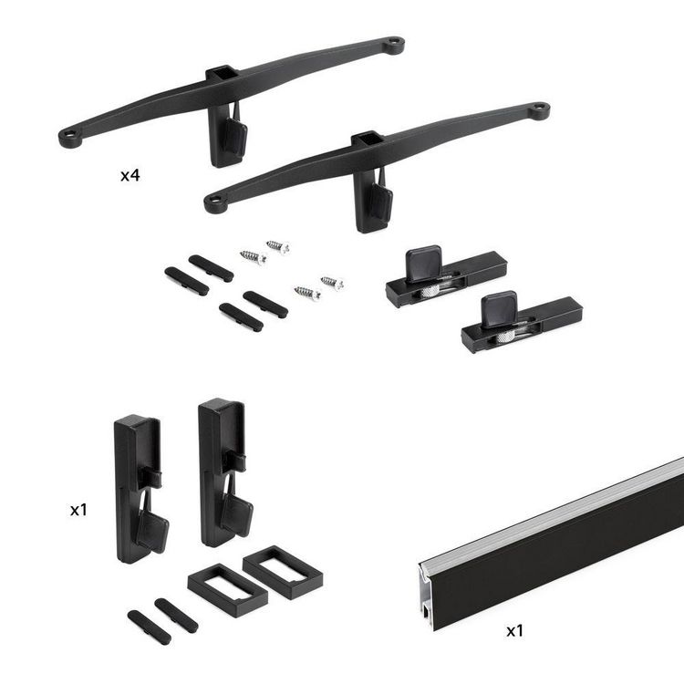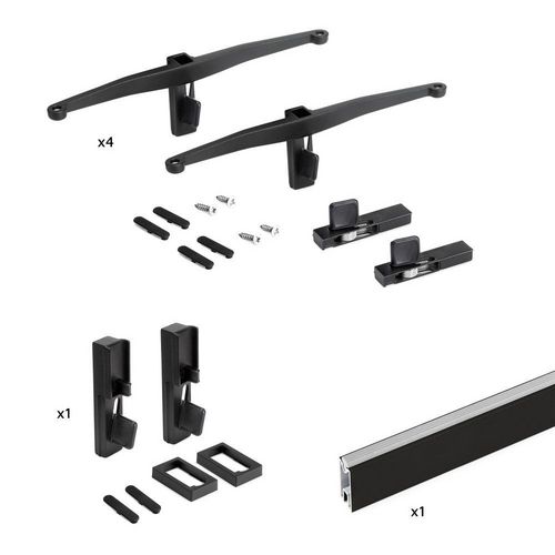 Kit de supports pour la structure modulaire Zero. Il se compose de 4 jeux de supports pour étagères en bois, 1 jeu de supports de tringle et une tringle de 1 m. Tous les accessoires permettant le montage au profil sont fournis.