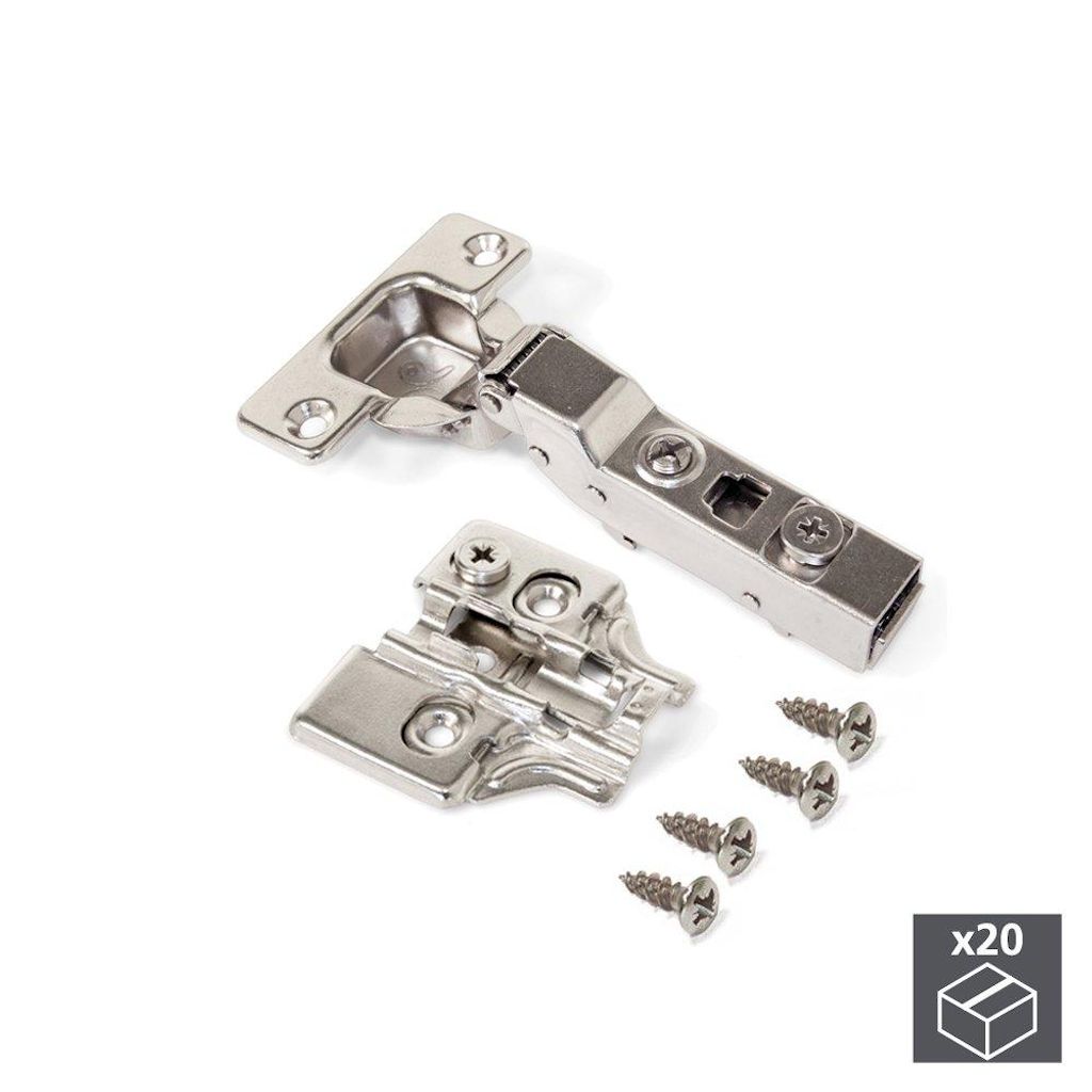 Lot de 20 charnières coudées pour montage en applique X91 avec fermeture amortieet embases avec réglage excentrique à visser