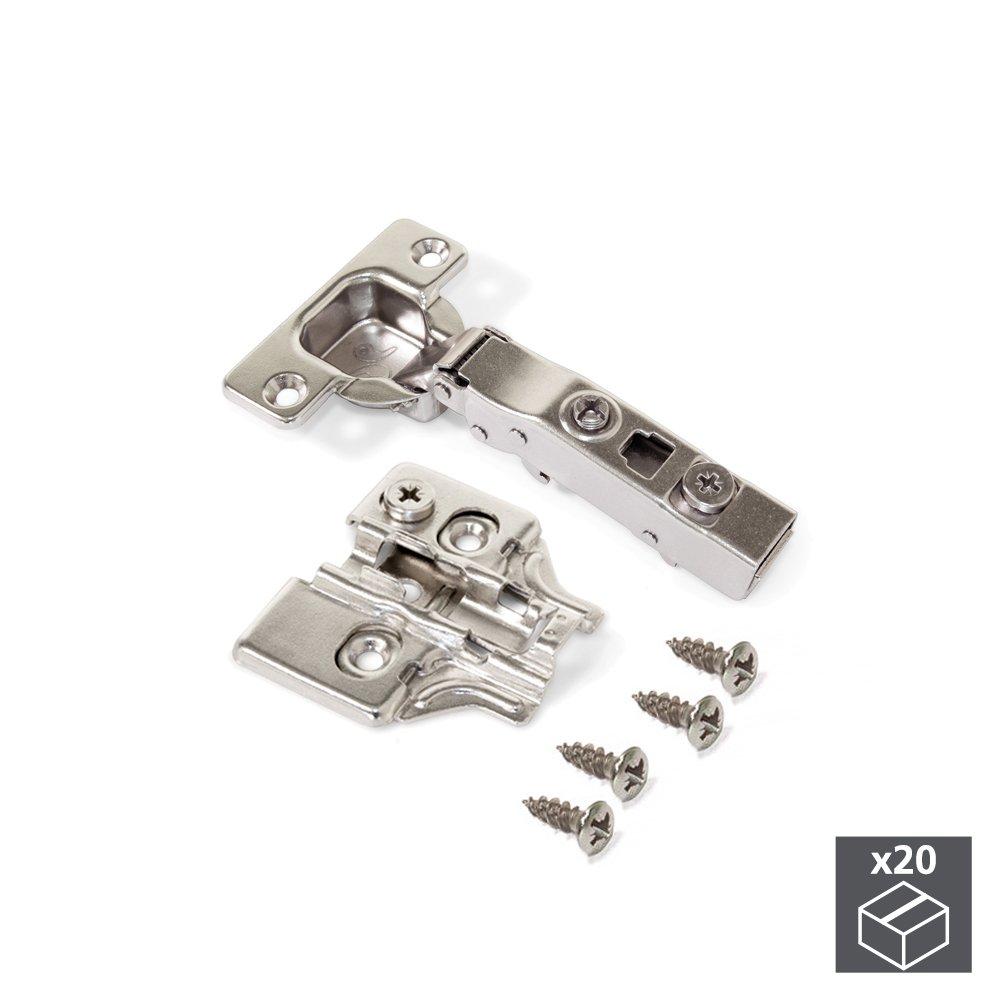 Lot de 20 charnières droites X91 avec fermeture amortieet embases avec réglage excentrique à visser