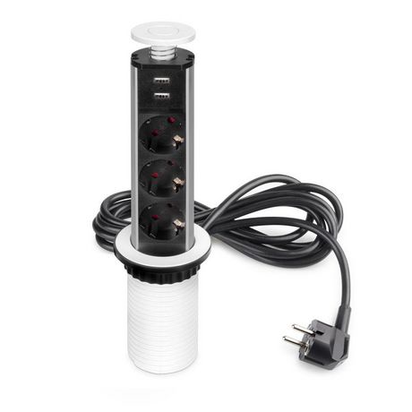 Multi-connecteur ou tour multiprises élevable , une solution efficace qui apporte de la fonctionnalité à vos meubles et qui reste totalement intégré dans les meubles de la cuisine, du bureau et de la maison. Parfait aussi bien pour les modules hauts que pour les modules bas grâce à son design rétractable et facilement dissimulable. Il s'adapte parfaitement aux bureaux dotés de passe-câbles. Il dispose de trois prises type Schuko avec puissance maximale admissible jusqu'à 3500W – 16A et de deux connecteurs USB pour charger des dispositifs électroniques 5V DC (1 x 1A / 2 x 0,5A), comme des smartphones ou des tablettes. Très versatile, le montage ne requiert qu'un usinage de D. 60 mm, et peut être installé dans des surfaces d'importante épaisseur, entre 1 y 95 mm. Il est fixé sur le meuble sans outils grâce à l'écrou de fixation manuelle. Il est doté d'un discret témoin d'allumage LED et d'un câble de 1,8 m avec prise pour 230V AC 50Hz.