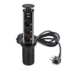 Multi-connecteur ou tour multiprises élevable , une solution efficace qui apporte de la fonctionnalité à vos meubles et qui reste totalement intégré dans les meubles de la cuisine, du bureau et de la maison. Parfait aussi bien pour les modules hauts que pour les modules bas grâce à son design rétractable et facilement dissimulable. Il s'adapte parfaitement aux bureaux dotés de passe-câbles. Il dispose de trois prises type Schuko avec puissance maximale admissible jusqu'à 3500W – 16A et de deux connecteurs USB pour charger des dispositifs électroniques 5V DC (1 x 1A / 2 x 0,5A), comme des smartphones ou des tablettes. Très versatile, le montage ne requiert qu'un usinage de D. 60 mm, et peut être installé dans des surfaces d'importante épaisseur, entre 1 y 95 mm. Il est fixé sur le meuble sans outils grâce à l'écrou de fixation manuelle. Il est doté d'un discret témoin d'allumage LED et d'un câble de 1,8 m avec prise pour 230V AC 50Hz.