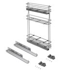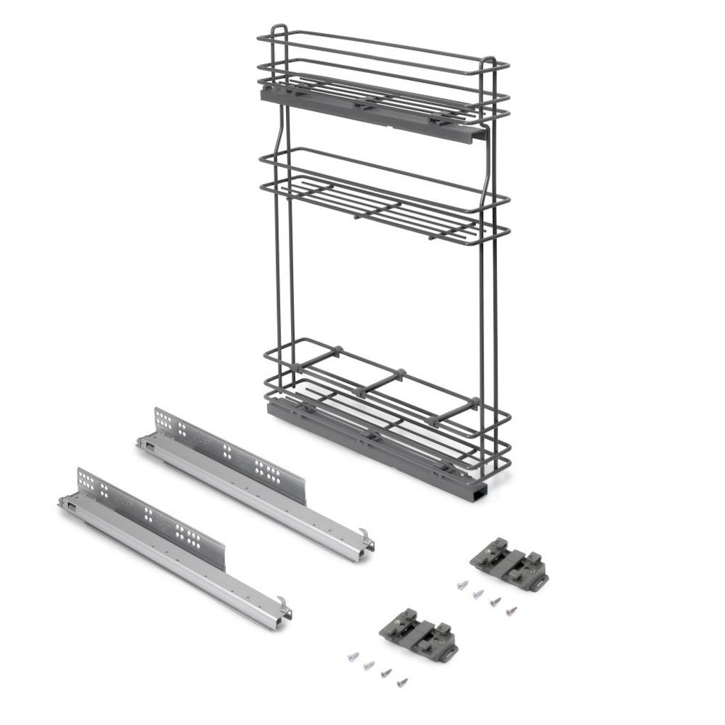 - Le montage se fait sur le côté gauche du meuble à l'aide de deux glissières à rouleaux avec extraction totale et fermeture amortie. Compatible avec des panneaux de 16, 18 et 19 mm.
