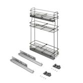 - Le montage se fait sur le côté gauche du meuble à l'aide de deux glissières à rouleaux avec extraction totale et fermeture amortie. Compatible avec des panneaux de 16, 18 et 19 mm.