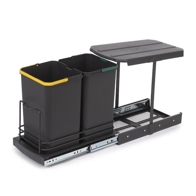 - Il est fait d'acier et de plastique dans une finition gris anthracite. Il dispose de deux poubelles d'une capacité de 12 litres chacune, avec une simple poignée pour faciliter l'extraction.