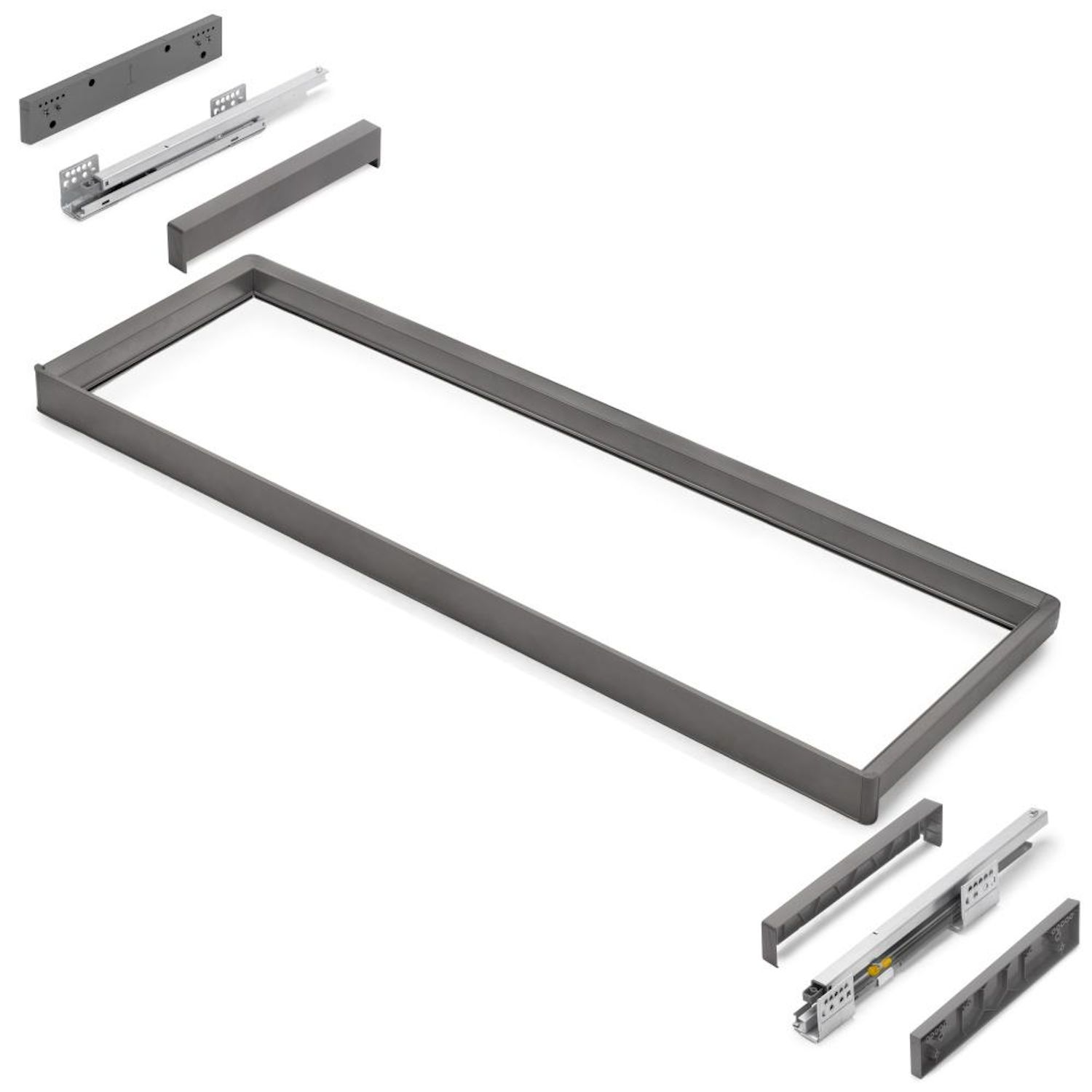 Le kit comprend tout ce dont vous avez besoin pour une installation rapide et soignée : 1 cadre, 1 jeu de coulisses, 1 jeu d'entretoises, 1 jeu d'enjoliveurs, 8 vis (Ø3,5x30 mm) et 4 vis (Ø4,5x20 mm), le tout dans un emballage soigné.