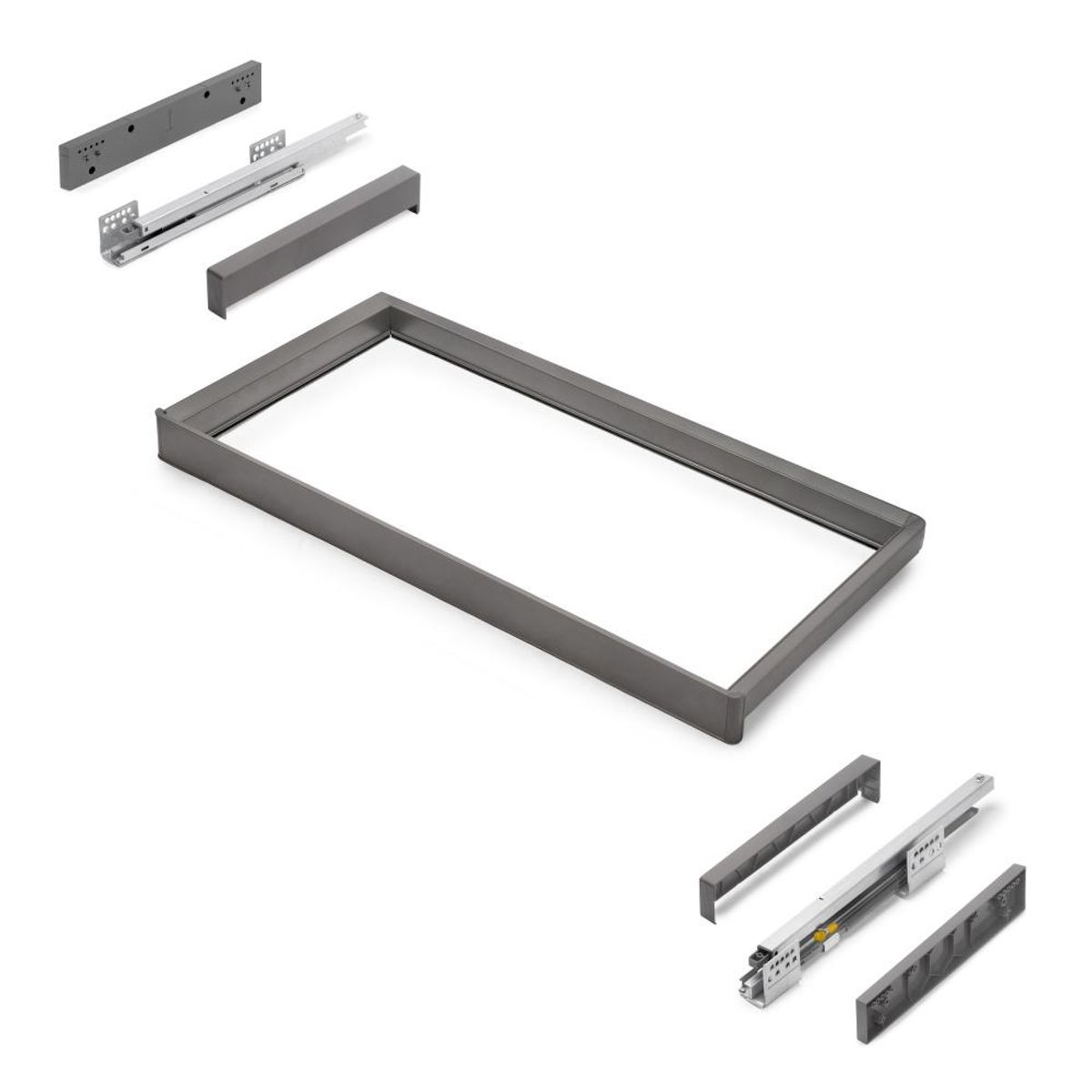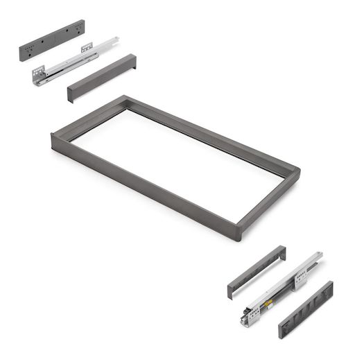 Le kit comprend tout ce dont vous avez besoin pour une installation rapide et soignée : 1 cadre, 1 jeu de coulisses, 1 jeu d'entretoises, 1 jeu d'enjoliveurs, 8 vis (Ø3,5x30 mm) et 4 vis (Ø4,5x20 mm), le tout dans un emballage soigné.