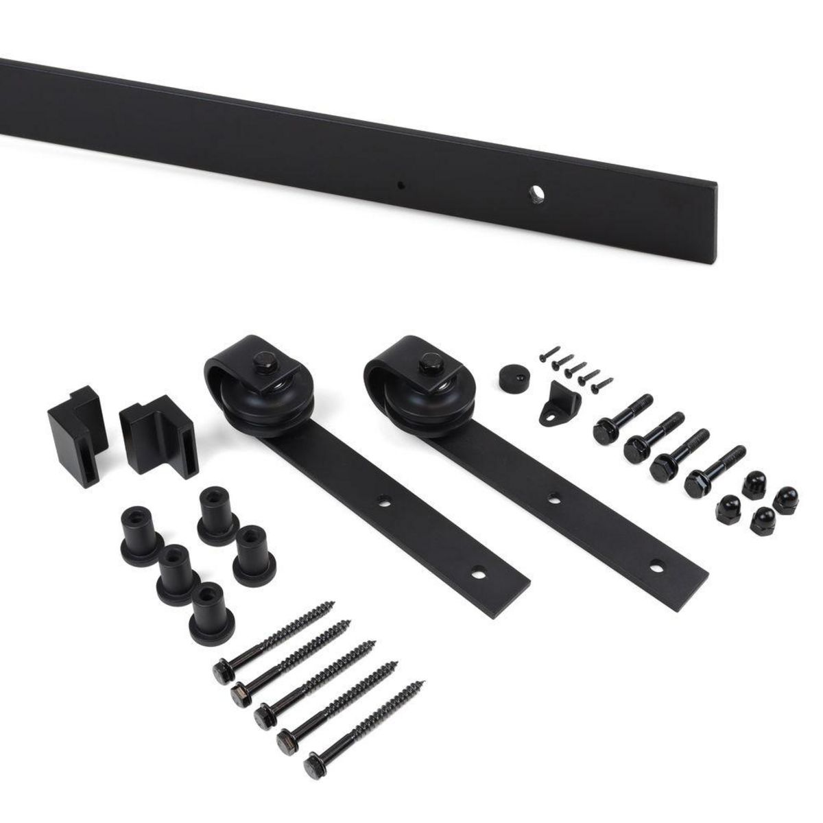 Le système est composé de un rail supérieur, de 2 mètres, deux chariots pour une porte, des accessoires anti-déraillement et des vis de montage et de fixation. Les panneaux ne sont pas incluses.