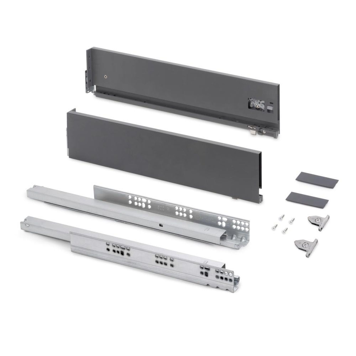 - Kit de ferrures nécessaires pour le montage d'un tiroir extérieur de hauteur 131 mm et profondeur 270 mm, n'incluant pas le fond, la façade ni la façade arrière.