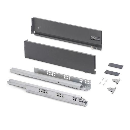 Comprend: deux côtés latérales, un ensemble de guides à fermeture amortie, un ensemble de couvre-garnitures et des attaches avant de tiroir.