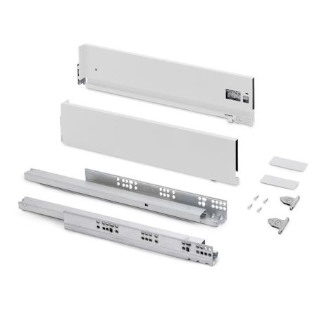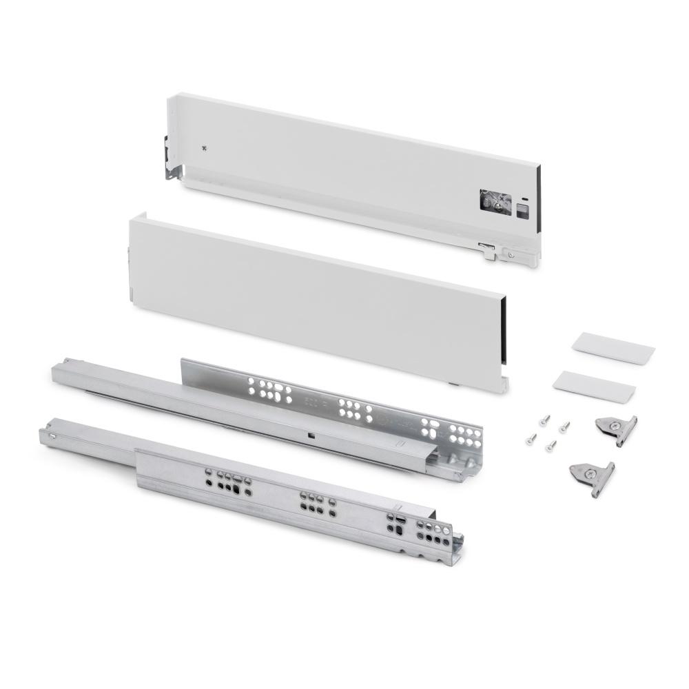 - Kit de ferrures nécessaires pour le montage d'un tiroir extérieur de hauteur 131 mm et profondeur 550 mm, n'incluant pas le fond, la façade ni la façade arrière.