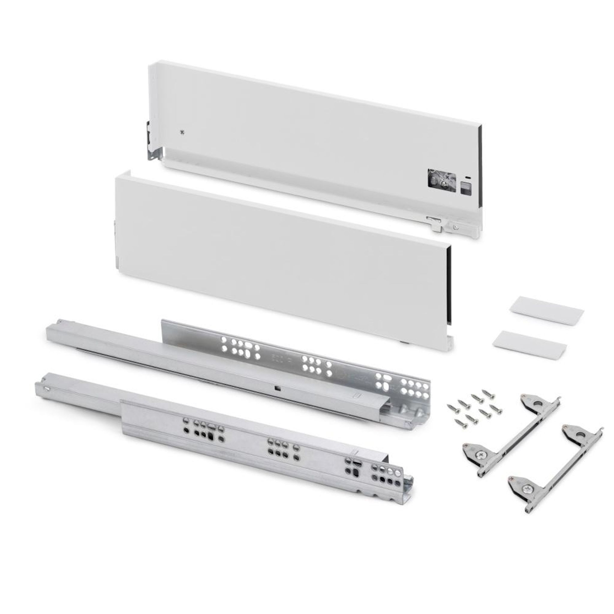 - Kit de ferrures nécessaires pour le montage d'un tiroir extérieur de hauteur 178 mm et profondeur 350 mm, n'incluant pas le fond, la façade ni la façade arrière.