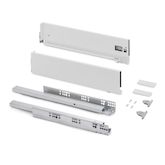 Comprend: deux côtés latérales, un ensemble de guides à fermeture amortie, un ensemble de couvre-garnitures et des attaches avant de tiroir.